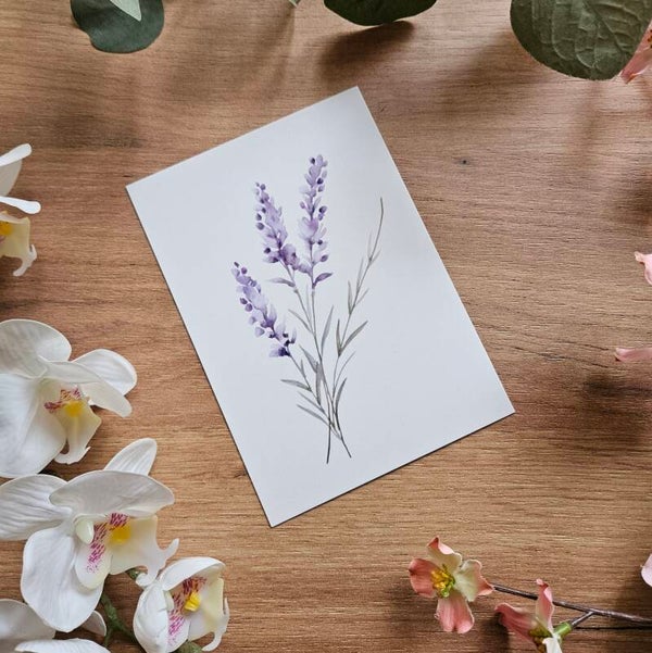 Auf der Postkarte ist ein Lavendelzweig zu sehen.