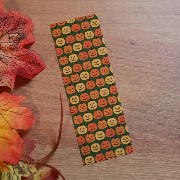 Lesezeichen aus Papier mit einem Kürbismuster.