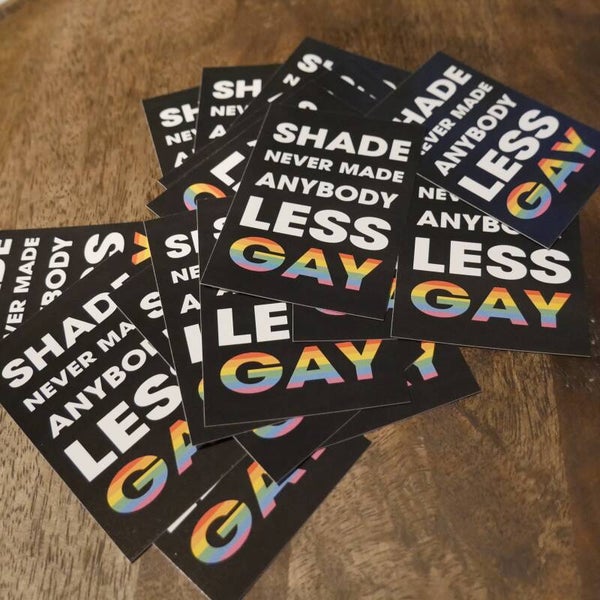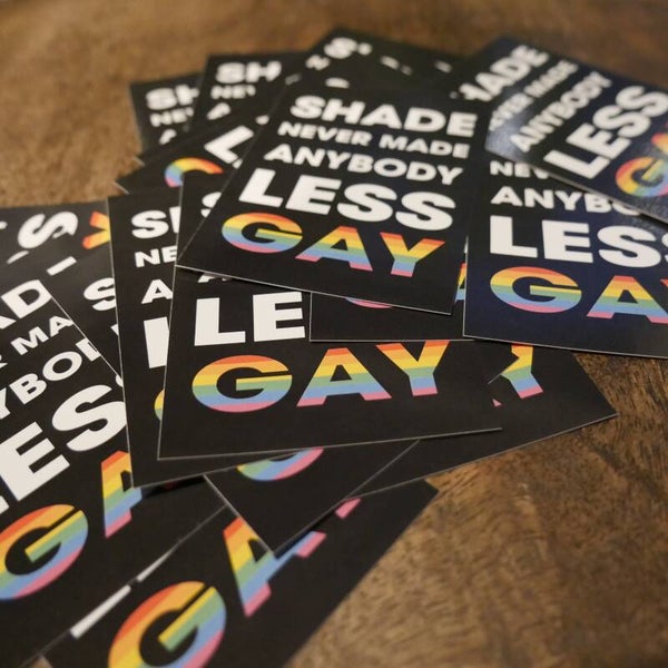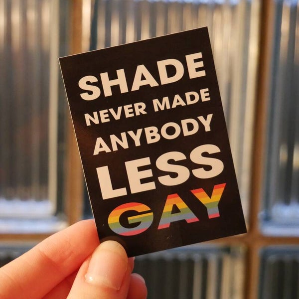 SHADE NEVER MADE ANYBODY LESS GAY als Aufkleber mit den Maßen 5,2 x 7,5 cm.